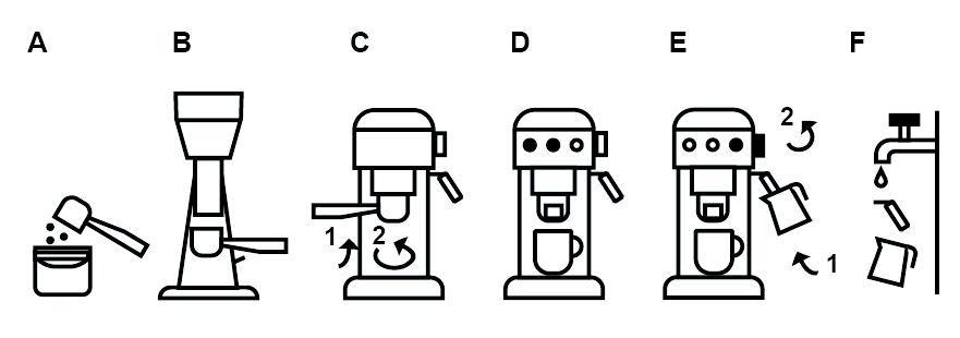 Setze den Siebträger unten in die Kaffeemaschine ein (3A, Position INSERT) und drehe den Handgriff in deine Richtung, so dass er gerade zu dir zeigt (3B, Postion CLOSE). Nun kannst du die obere linke oder mittlere Tastedrücken, je nachdem wieviel Wasser du bevorzugst.