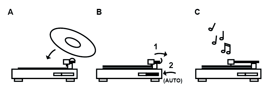 Der Schallplattenspieler ist vollautomatisch. Bitte den Ton-Arm nicht per Hand bedienen. Zum Abspielen die Platte auflegen (A), die Befestigung vom Ton-Arm lösen (B1) und einfach den großen Knopf ganz rechts an der Vorderseite des Plattenspielers drücken (B2). Der Ton-Arm wandert automatisch zur Platte und die Musik spielt.